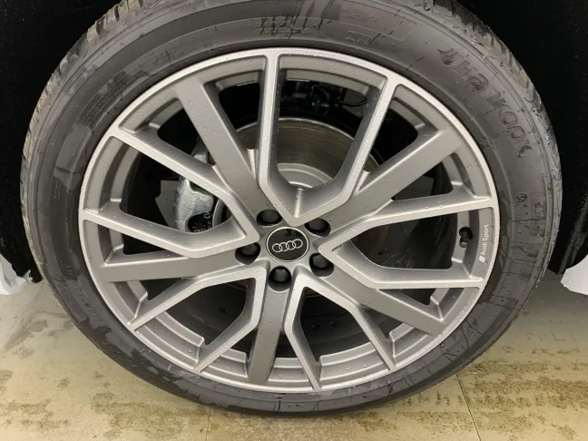 - Jantes en aluminium coulé 20″ Audi Sport 5 branches en V en étoile, finition titane mat, polies brillant, 8.5Jx20″, pneus 255/40 R20