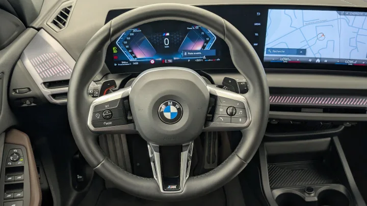 Volant M gainé cuir (avec surpiqûres noires) Trois branches. Jante en cuir noir ‘Walknappa’, inserts chrome perlé et repose-pouce dans le volant. Logo M sur la base du volant