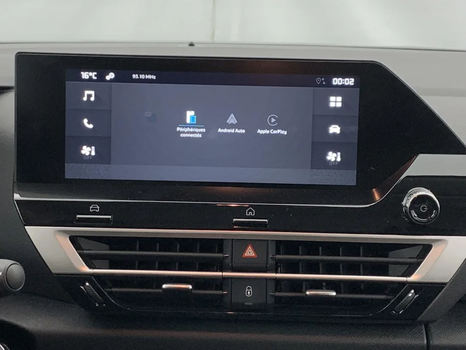 - Ecran central 10″ tactile: – Système audio numérique (DAB) 6 haut-parleurs – Apple CarPlay et Android Auto – Reconnaissance vocale – Kit mains libres Bluetooth – Boîtier télématique : Appel d’urgence et Citroën Assistance